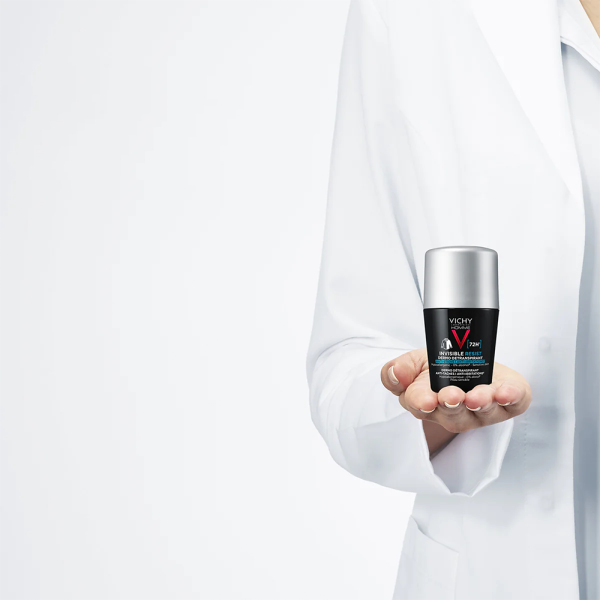 Vichy Homme Invisible Resist [72H] Dermo Detranspirant roll-on antiperspirant pruža efikasnu zaštitu od neprijatnih mirisa i znojenja tokom 72 sata¹. Hipoalergeno. 0% alkohola².
