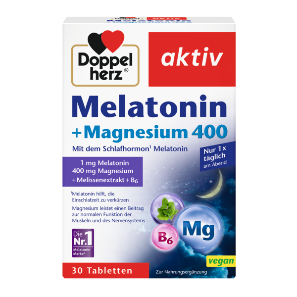 Doppelherz Aktiv Melatonin + Magnezijum 400 sadrže kombinaciju od 1mg melatonina, 400mg magnezijuma, poznatog biljnog sastojka, ekstrakta matičnjaka i vitamina B6. Melatonin je hormon koji se prirodno stvara u telu, a proizvodi ga epifiza u međumozgu. Prirodna proizvodnja melatonina počinje nakon što se smrači i dostiže maksimum između 2 i 4 sata ujutro. U drugoj polovini noći, nivo melatonina opada. Melatonin doprinosi skraćivanju vremena potrebnog za zaspivanje. Da bi se postigao pozitivan efekat, preporučuje se uzimanje 1mg melatonina neposredno pre odlaska na spavanje.
