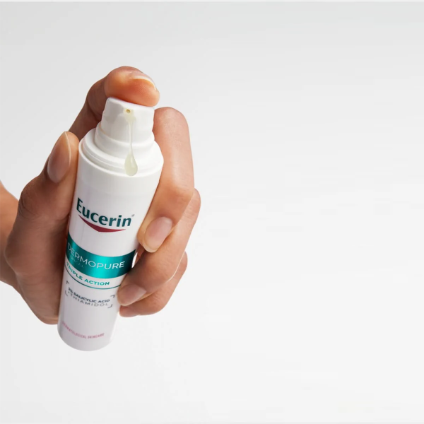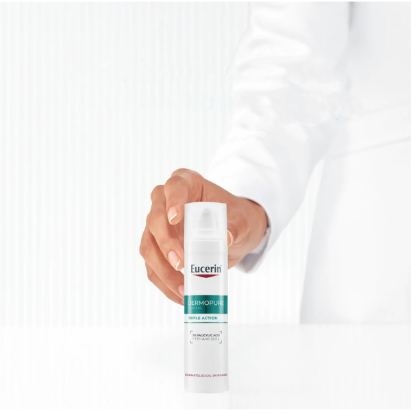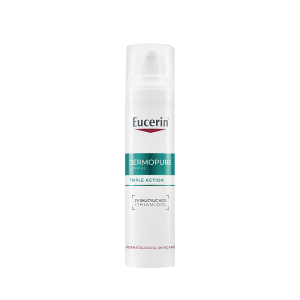 Eucerin DermoPure Clinical Triple Action serum koriguje i sprečava nastanak tri glavne vrste nepravilnosti: akne, hiperpigmentacije i mitisere. Formulisan za masnu i kožu sklonu aknama, ovaj korektivni serum bez ulja ciljano deluje na nepravilnosti, a pritom zadržava laganu teksturu. Efikasno deluje na kožni mikrobiom i obezbeđuje neophodnu hidrataciju. Deluje preventivno protiv ponovnog izbijanja akni do 12 nedelja nakon korišćenja. Thiamidol® je patentirani sastojak poznat po svojoj efikasnosti u borbi protiv hiperpigmentacija, delujući na sam uzrok problema. Deluje tako što inhibira ljudsku tirozinazu - ključni enzim u procesu stvaranja melanina. Hiperpigmentacije mogu nastati iz različitih razloga, poput pega izazvanih sunčevim zračenjem, postupalnih tragova od akni ili staračkih fleka.