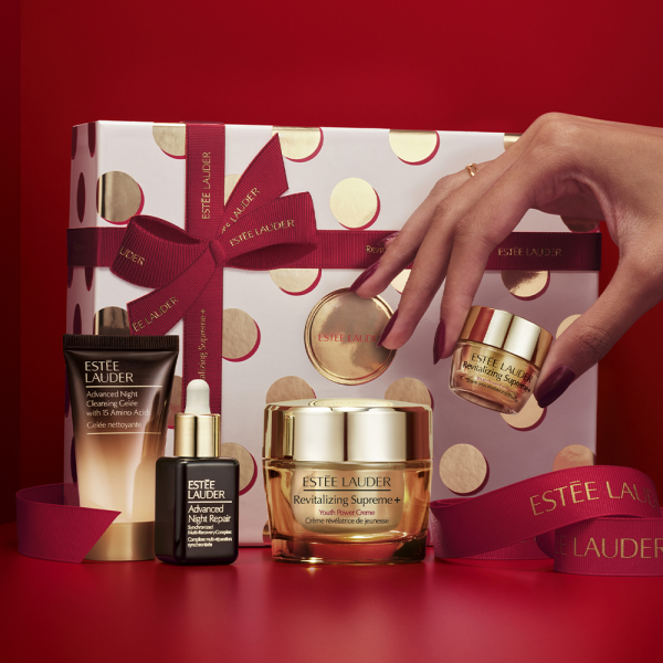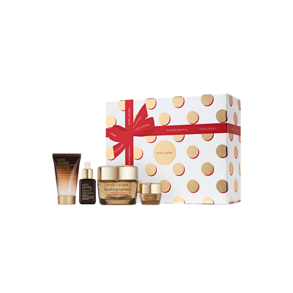 Estée Lauder praznični set sa izabranim proizvodima za intenzivnu revitalizaciju i hidrataciju kože lica. Ovaj praznični set sastoji se od proizvoda koji su pravi ritual nege kože, a koji pruža mladalački sjaj, elastičnost i dugotrajnu negu. Set se sastoji od Estée Lauder evitalizing Supreme+ Youth Power Creme u punoj veličini 50ml, kao i mini pakovanjima gela za pranje lica Advanced Night Cleansing Gelée 30ml, mini seruma za negu kože lica Advanced Night Repair Synchronized Multi-Recovery Complex 15ml, kao i mini kreme za predeo oko očiju Revitalizing Supreme+ Youth Power Eye Balm 5ml.