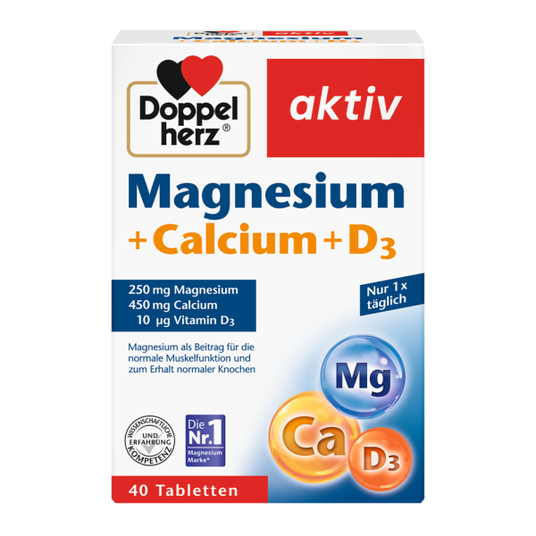Vitamin D telo može da proizvodi samostalno redovnim izlaganjem kože sunčevoj svetlosti. Međutim, ova sopstvena proizvodnja često nije dovoljna u našim geografskim širinama. Magnezijum, kao esencijalni mineral, podržava funkciju mišića. Kalcijum je kao relevantna hranljiva materija za kosti značajno uključen u razvoj i očuvanje kostiju. Vitamin D, „pomoćnik za ugrađivanje kalcijuma“, pospešuje apsorpciju kalcijuma u telu i pomaže pri njegovom ugrađivanju u kosti. Dodatak ishrani Doppelherz kombinuje u samo jednoj tableti dnevno 250mg magnezijuma, 450mg kalcijuma i 10µg vitamina D3 na sledstven način.